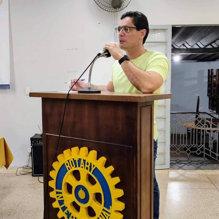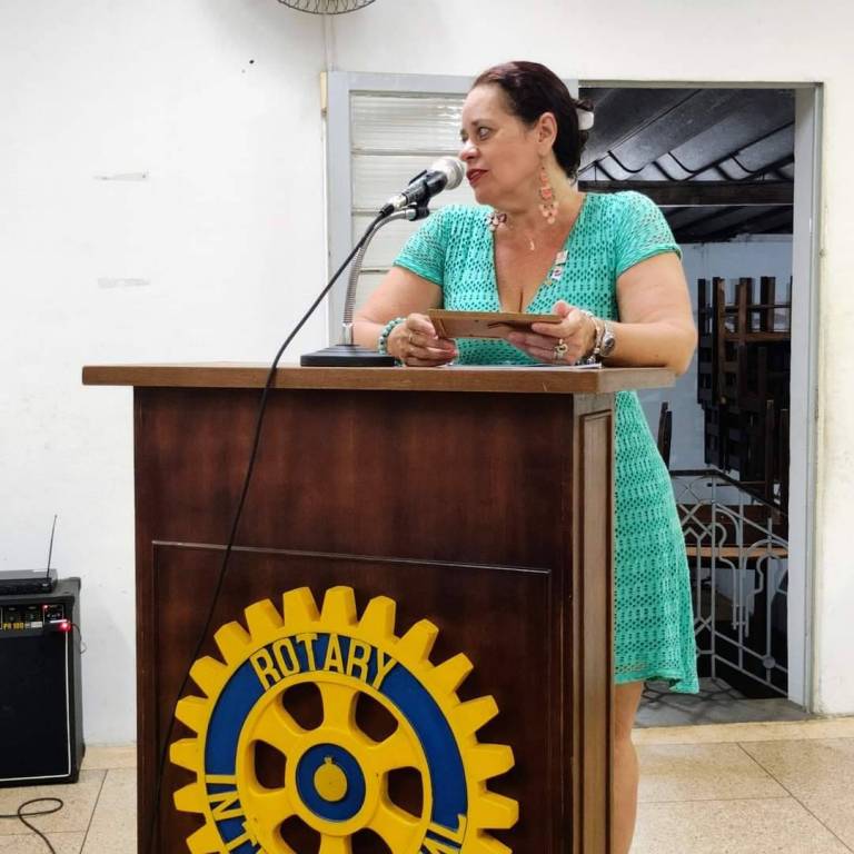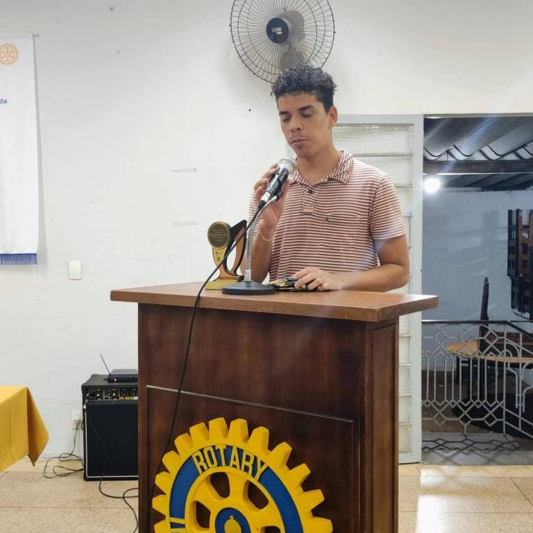 Audiodescrição: na foto, uma tribuna com simbolo do Rotary - roda rotária em amarelo. Um microfone e uma jovem de cabelos cacheados escuros, vestido preto, com uma caderno na mão falando ao microfone.