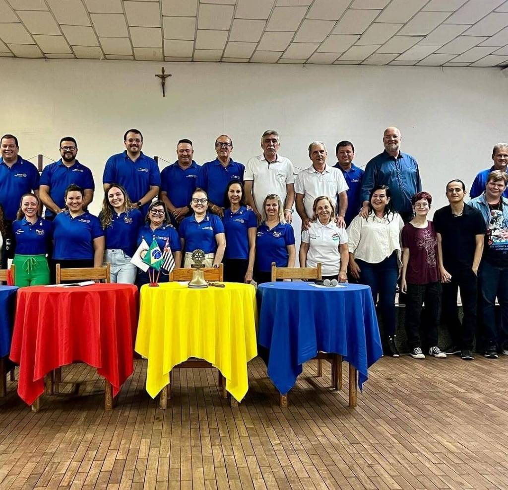 Audiodescrição: na foto, um salão com no fundo um telão com informações. Na frente 3 mesas redondas, cada uma com uma cor de toalha, azul amarela e vermelha, em cima, bandeiras do Rotary, Brasil e SP, em miniaturas e o sino rotário. Na frente das mesas, um senhor calvo, falando ao microfone, usa camisa social e calça escura. Ao seu lado direito, parte de uma tribuna.
