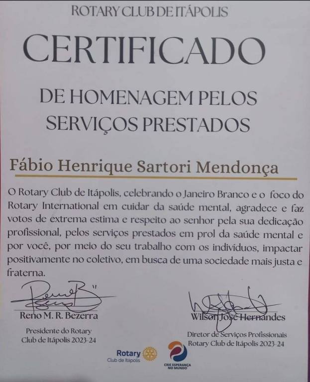 O Rotary Club de Itápolis teve a satisfação de receber o psicólogo e acupunturista Fábio Henrique Sartori Mendonça para proferir uma palestra sobre o tema “Janeiro Branco: cuidando da nossa saúde mental”. Posteriormente, Fábio foi homenageado pelo Pres. do clube - Reno Bezerra e pelo diretor de Serviços Profissionais Wilson Hernandes, em reconhecimento ao seu notável trabalho em prol da saúde mental na nossa comunidade. Agradecemos também a presença de sua esposa Adriana Del Forno Mendonça, seu filho Davi, sua filha Isabela e seu genro Gustavo. Foi uma verdadeira honra tê-los conosco nesta noite.