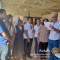 Na foto observamos uma grande mesa branca com várias caixas de eletrodomésticos novos em cima dela. Atrás da mesa várias pessoas entre homens e mulheres estão juntas e sorridentes. O local é fechado, iluminado e observamos que as telhas de zinco e as paredes são pintadas de amarelo e existe um ventilador na parede da lateral esquerda. Atrás das pessoas existe um tecido listrado preto e branco preso nas vigas do teto. Ao lado direito do tecido listrado temos um outro tecido azul e do lado esquerdo um tecido vermelho. Abaixo no canto direito da imagem temos a logo do Rotary Club de São José do Rio Preto Novo Cinquentenário.