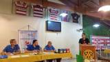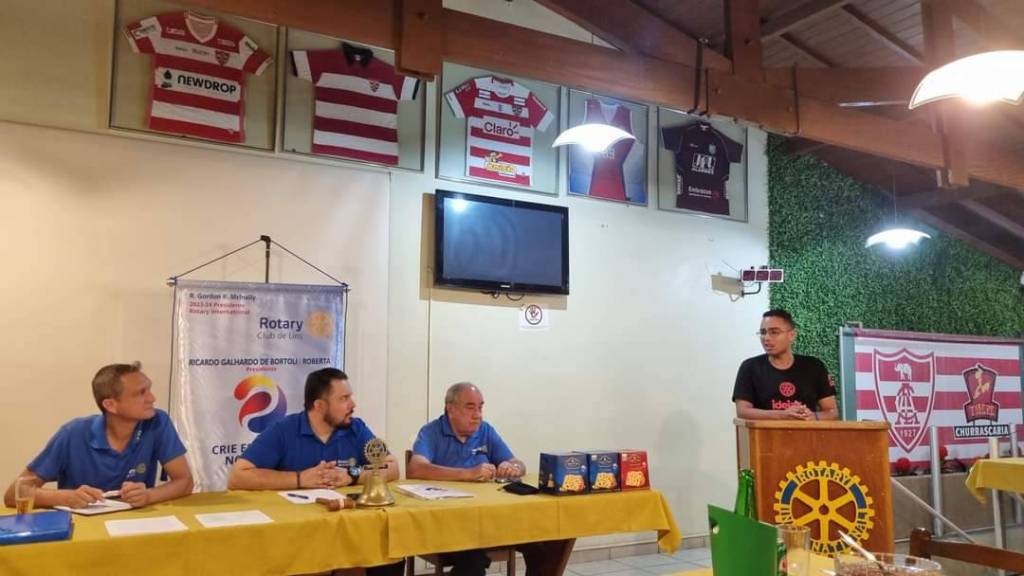 Na foto observamos uma mesa com toalha amarela e 3 homens vestidos com camiseta azul do Rotary sentados atrás dela. Na mesa existem vários objetos usados em uma reunião rotária. Atrás deles um banner da gestão atual. Na lateral direita um jovem de camiseta preta discursa em uma tribuna de madeira com a roda rotária grande na frente .