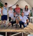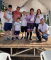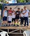 Audiodescrição: na foto, várias pessoas identificadas, entre elas dois policiais, todos posam pra foto, estão na frente de uma tenda azul, no fundo nota-se a imagem de uma igreja, algumas arvores e o chão todo desenhado como calçadão. Nota-se ainda alguns banners pendurados entre as arvores com simbolo do lema crie esperança no mundo.