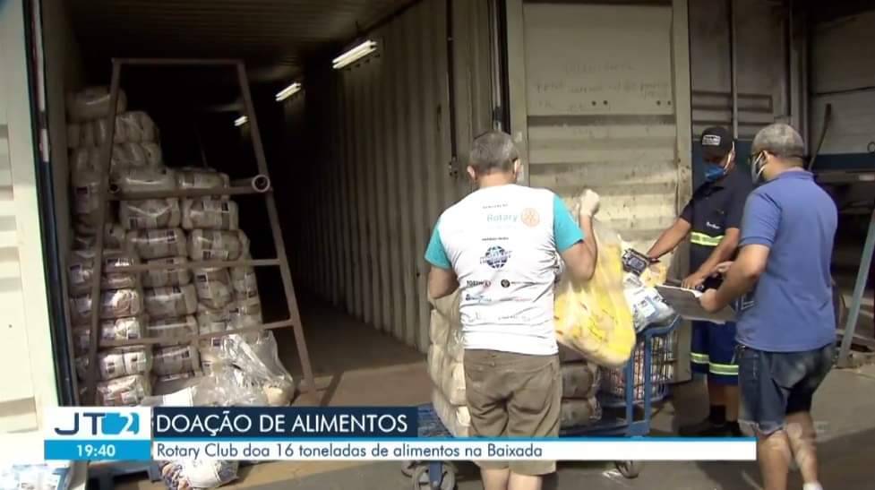 Audiodescrição: na foto, um depósito com várias cestas básicas, 3 pessoas se locomovendo e tirando elas de um lado para o outro. Na frente, uma tarja de reportagem JT 19:40 - Doação de alimentos, Rotary Club doa 16 toneladas de alimentos na Baixada.