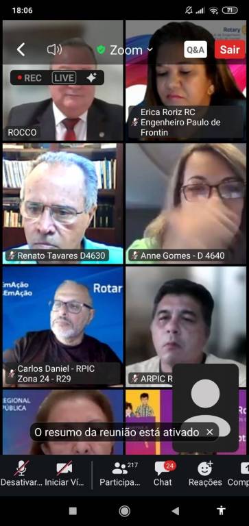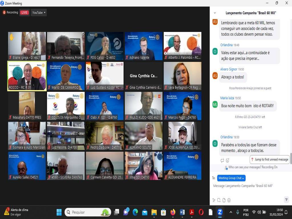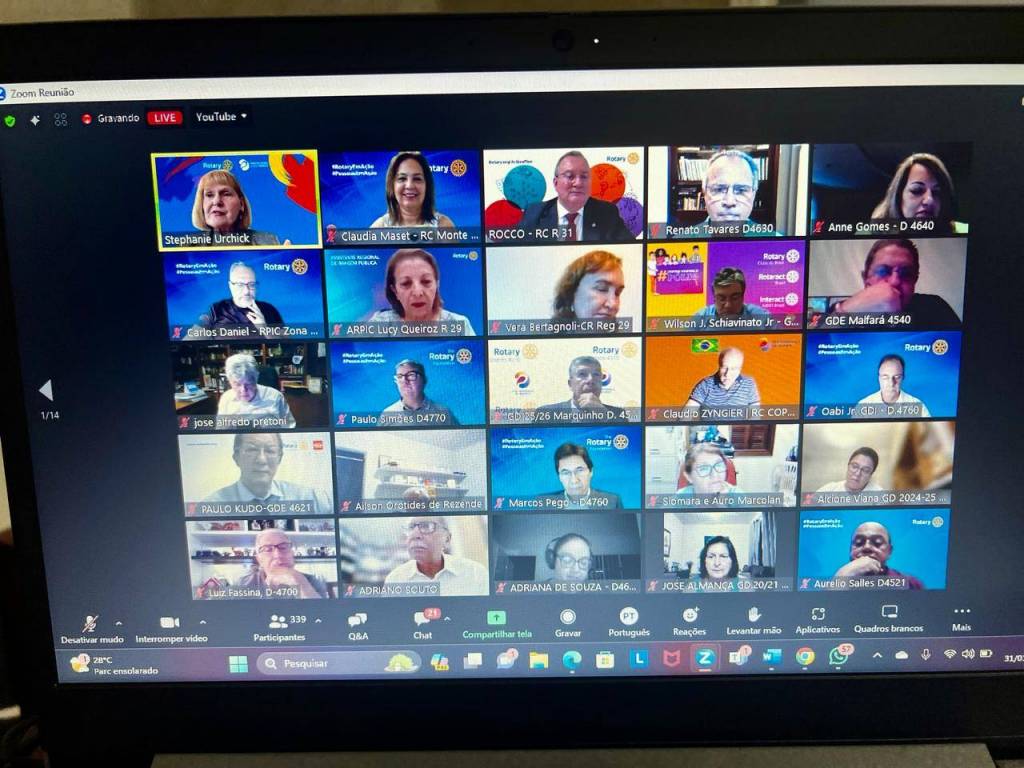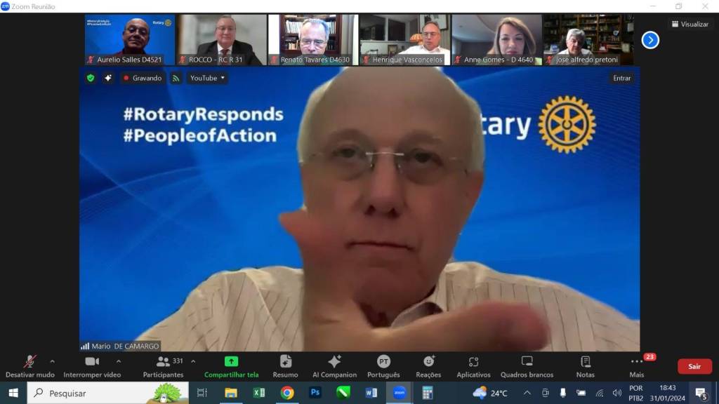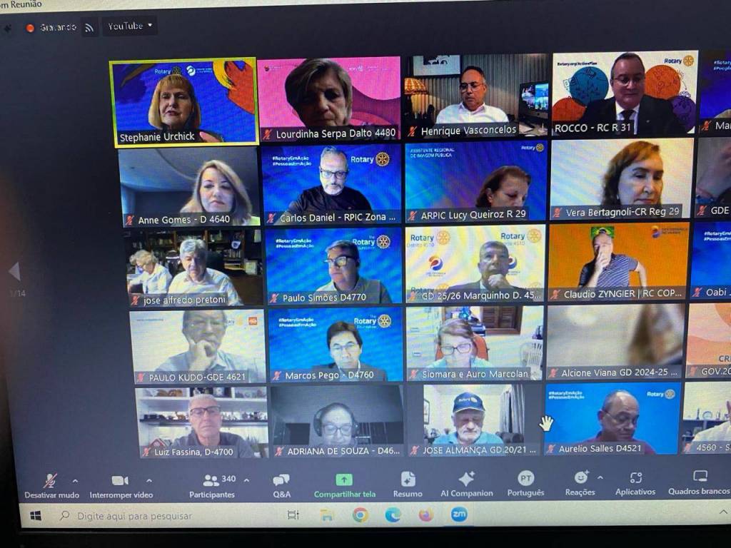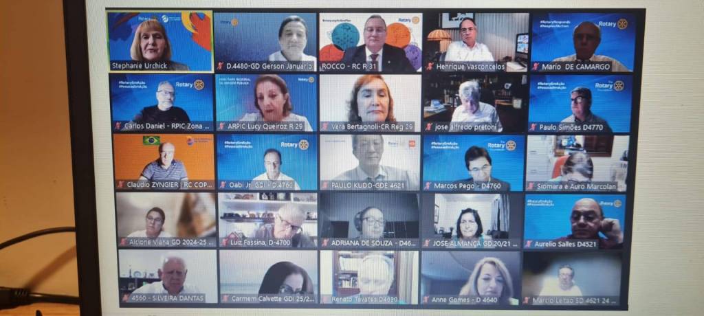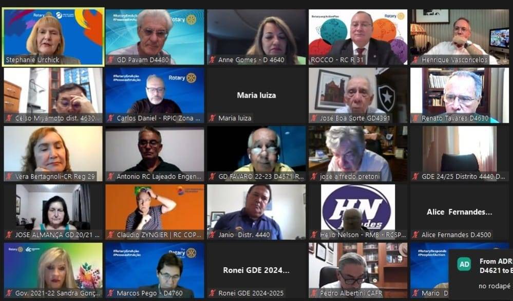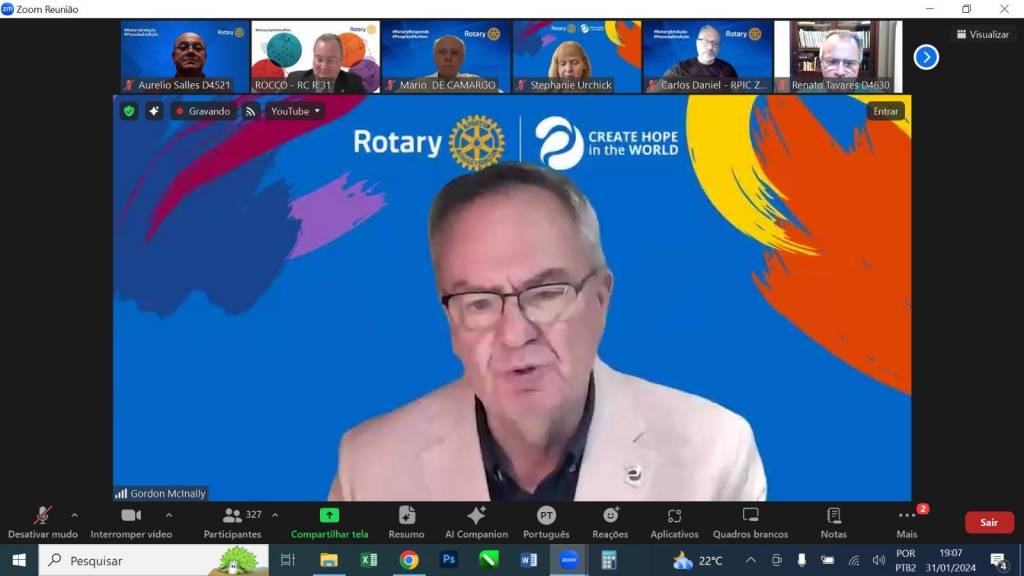 Audiodescrição: na foto, uma tela de computador, com várias telinhas com pessoas na parte superior, no centro a foto do presidente RI Mario Cesar e na foto abaixo presidente RI Gordon. No fundo das fotos, simbolos Rotary e lema crie esperança no mundo, com um fundo azul e algumas cores aquareladas. Na parte inferior, várias abas de uma sala de reunião online.