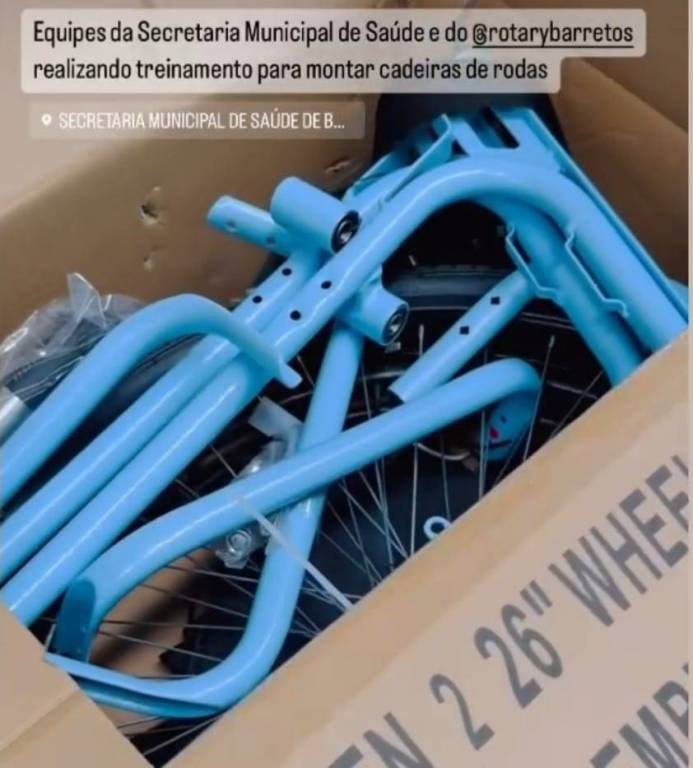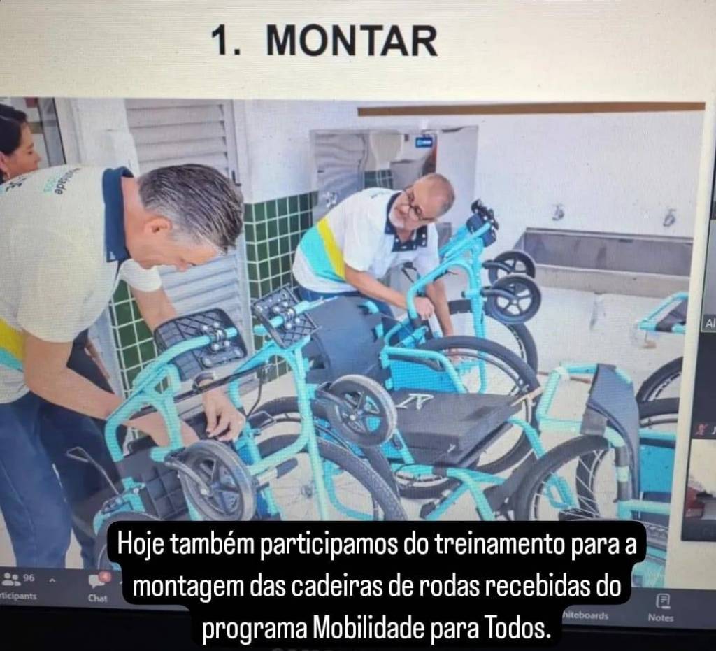 No final da foto dentro de um quadro preto, temos em letras brancas: Hoje também participamos do treinamento para a montagem das cadeiras de rodas recebidas do programa Mobilidade para Todos.