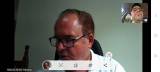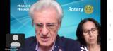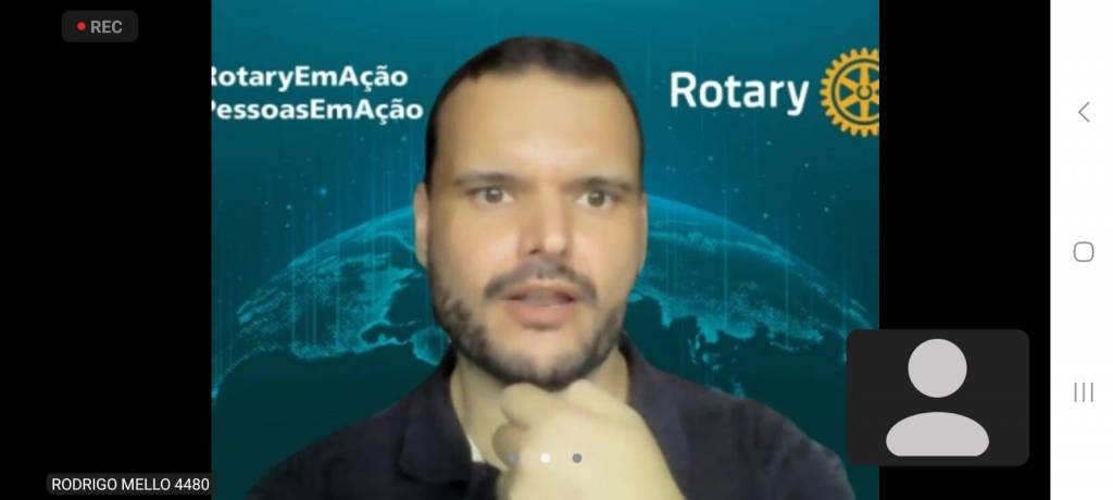 No canto superior esquerdo temos na tela do computador, a imagem de um jovem de barba rala com a mão no queixo. Parece estar fazendo um pronunciamento. A palavra Rotary está em destaque nessa janela assim como: Rotary em ação, pessoas em ação.
