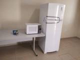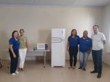 Audiodescrição: na foto, várias pessoas identificadas, algumas vestem camiseta do Rotary, outras, jaleco e/ou roupa/uniforme de hospital. Parecem estar em uma sala, onde observamos um micro-ondas em cima de uma mesa e uma geladeira entre as pessoas, todas posam para foto e sorriem discretamente.