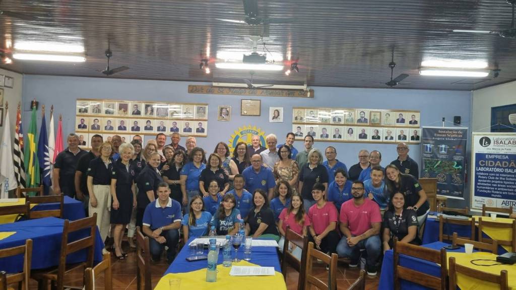 Audiodescrição: na foto, várias pessoas identificadas, posam para foto, estão em pé atras de uma mesa com toalha azul e roda rotária em dourado, em cima, o sino rotário. Atrás, na parede, várias fotos de antigos presidentes, uma roda rotária no centro, na parte de baixo outra foto com mais pessoas em pé, no mesmo ambiente, nota-se lado esquerdo pavilhão de bandeiras e outras mesas.