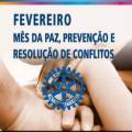 Audiodescrição: Foto de mãos humanas sobrepostas, as de baixo são de adultos e as de cima de crianças. No canto superior esquerdo, próximo ao centro está escrito em azul - Fevereiro, Mês da Paz, Prevenção e Resolução de Conflitos. Abaixo, também em azul sobrepondo as mãos encontra-se a imagem da roda rotária.