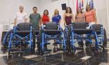 Audiodescrição: na foto, várias pessoas identificas, estão em pé, todos estão com as mãos em cima de cadeiras de rodas, sorriem. parecem estar numa sala com piso escuro e cortina branca ao fundo com caixa de som na parede.
