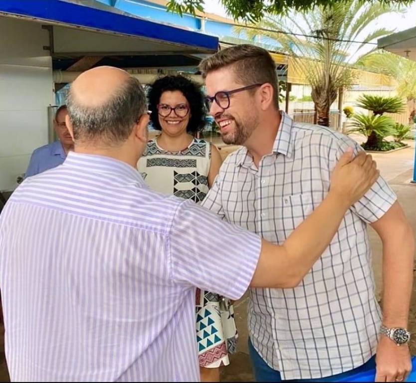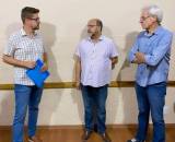 Na foto identificamos 3 homens em um ambiente fechado e iluminado, com pessoas ao fundo, sendo o da lateral direita nosso Gov. do Distrito José Luíz Pavam.