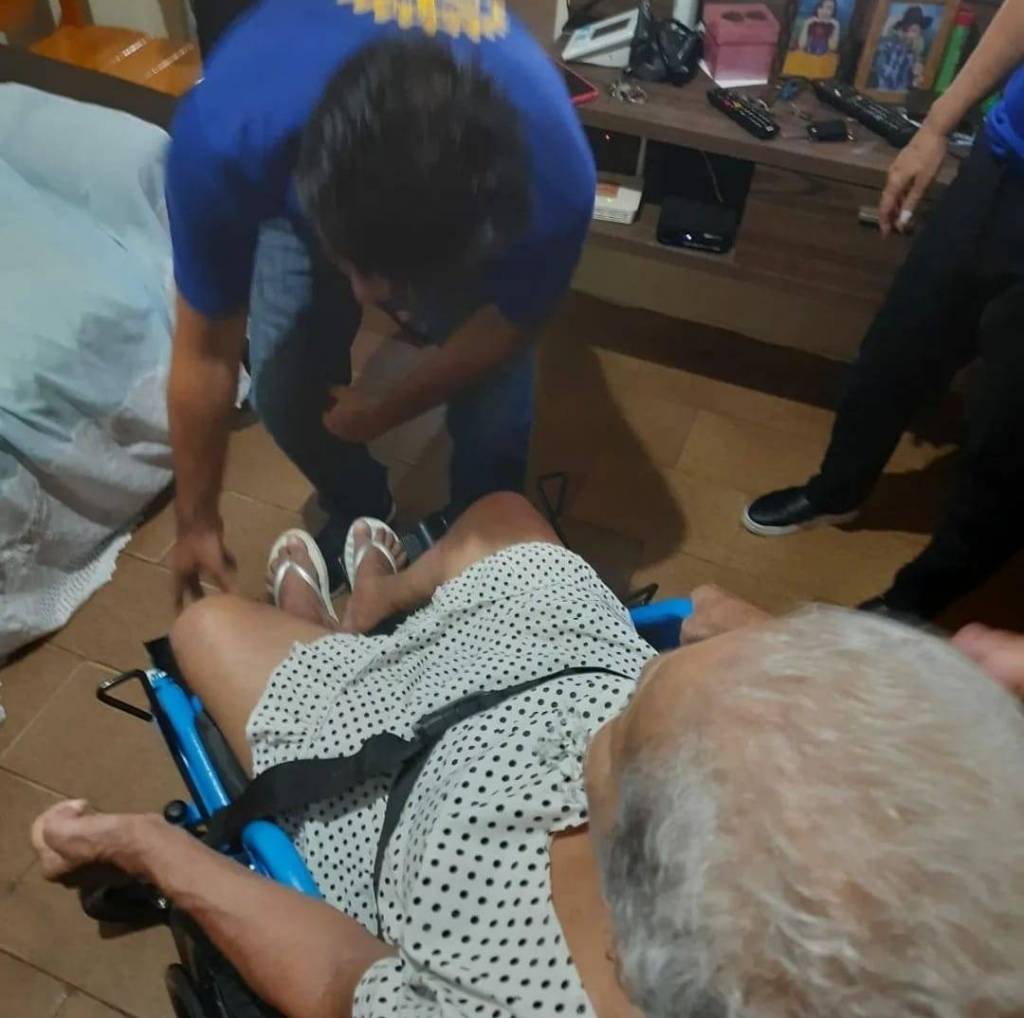 Na foto temos sentada em uma cadeira de rodas bem no centro uma senhora idosa de cabelos brancos, vestindo roupa clara e trazendo uma atadura medicinal no braço esquerdo.