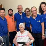 Atrás dela temos 3 homens e 3 mulheres. Somente um dos homens veste uma camiseta laranja, o restante das pessoas estão vestindo camiseta azul do Rotary. Todos estão sorridentes.