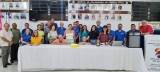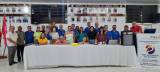 Audiodescrição: na foto, imagem de várias pessoas atrás de uma mesa bem grande, umas estão em pé e outras agachadas. Todos sorriem. Em cima da mesa se nota um bolo e o sino rotário, além de um notebook e uma caixa de som. Do lado direito da foto, um banner com lema do crie esperança n mundo, do lado esquerdo o pavilhão de bandeiras. Atrás, na parede, fotos de galerias de antigos presidentes.