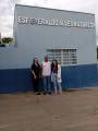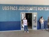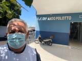 Na foto 3 pessoas identificadas: 2 mulheres e um homem no centro. A mulher da ponta esquerda veste calça e camiseta escura, usa óculos e tem cabelos longos preto. No centro o senhor grisalho veste camiseta branca com detalhes em vermelho, calça jeans e usa óculos. Na direita uma jovem de cabelos pretos, calça jeans, blusa escura e jaleco branco sorri e faz pose. O trio está na frente de uma parede pintada em 2 tons de azul com uma janela de ferro branca com vidros fechados que trás acima em letreiro grande prata: ESF. Everaldo Alves Nazareth. O lugar é aberto e podemos observar o céu nublado acima.
