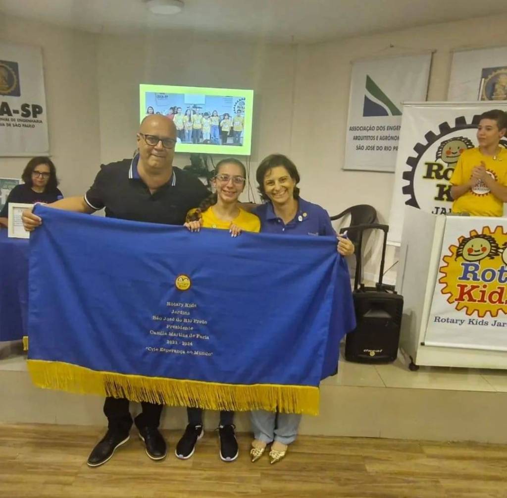 Na foto 3 pessoas: 1 homem, 1 garota e 1 mulher, seguram um tecido azul grande com franja amarela, trazendo o símbolo do Rotary Kids bordado com algumas palavras em branco abaixo.