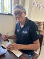 Na foto identificamos 3 mulheres e 1 homem. Todos estão de toca higiênica na cabeça e exceto uma das mulheres todos vestem camiseta azul do Rotary.