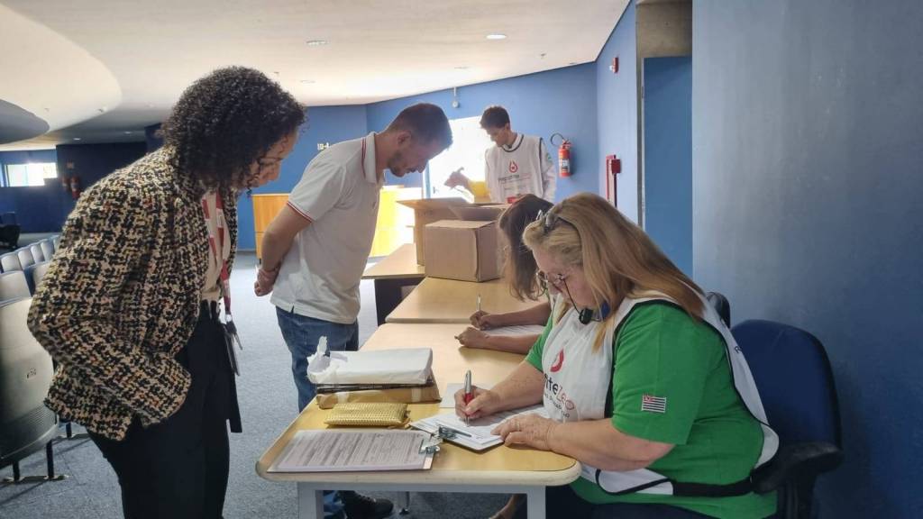 A 1° mulher trás nas mãos uma prancheta de madeira com folhas escritas presas a ela. A última trás nas mãos folhetos explicativos sobre Hepatite. Eles estão à frente de uma parede com azulejos quadriculados pequenos bege.