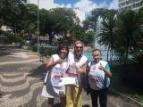 Na foto 2 mulheres e um homem ao centro. Todos estão vestidos com colete da campanha Hepatite Zero e usam máscara branca.