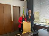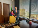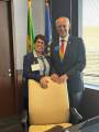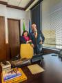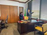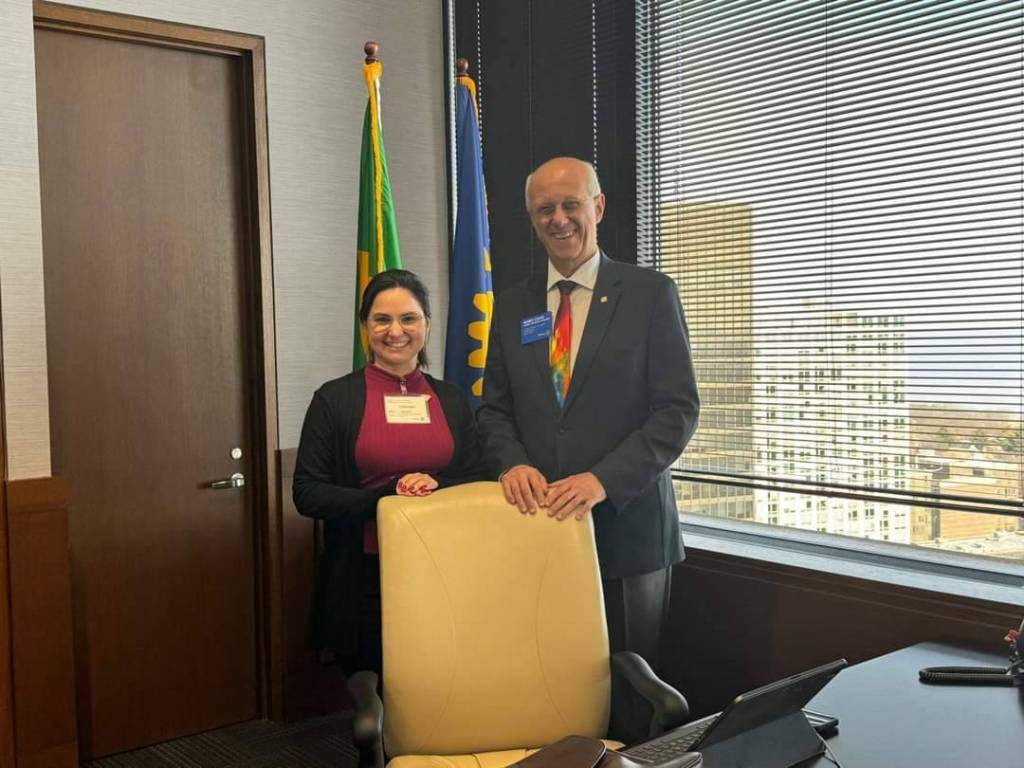 Audiodescrição: na foto, 4 pessoas identificas, do lado direito para o esquerdo, uma jovem de cabelos amarrados, com as mãos para baio, sorri, do seu lado, pres. 25-26 RI Mario Cesar, com as mãos em cima de uma cadeira, muito sorridente. Ao seu lado uma jovem loira, com as mãos para baixo, sorridente e ao seu lado uma jovem senhora com cabelos curtos, escuros, sorridente, com as mãos para baixo. Atrás deles o pavilhão de bandeiras e do lado direito no fundo uma janela com cortina persiana. e uma porta fechada lado esquerdo .