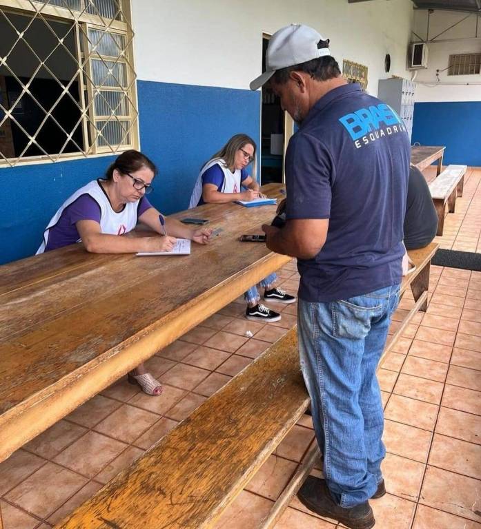 Audiodescrição: na imagem, duas pessoas do lado direito de uma mesa, uma sentada e outra em pé com uma prancheta, a que está sentada está testando sangue de um rapaz sentado de frente e ao lado dele uma senhora sentada também. Em cima da mesa várias caixinhas com testes.