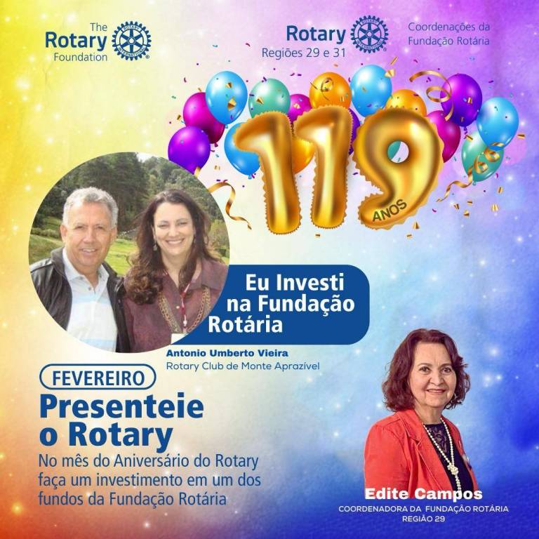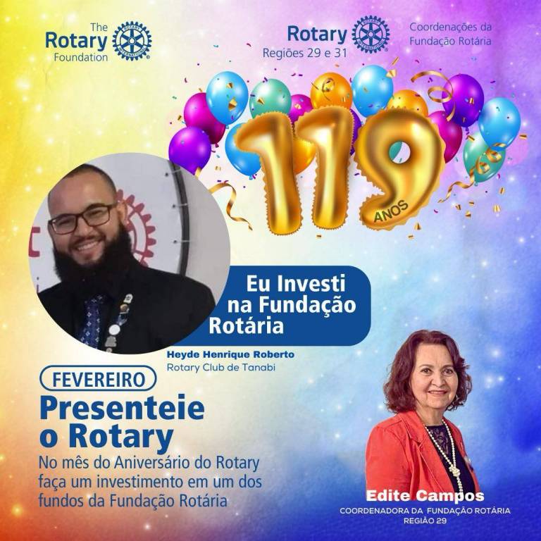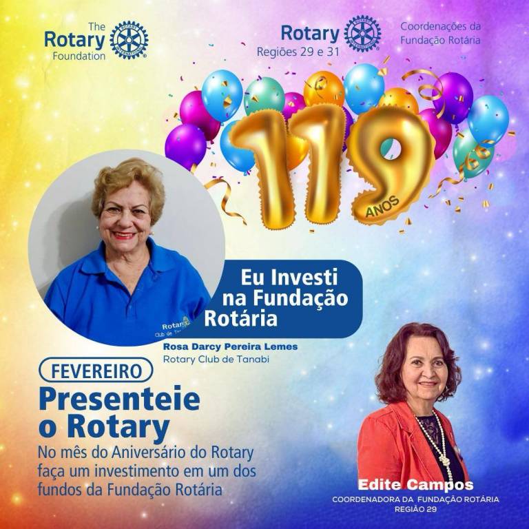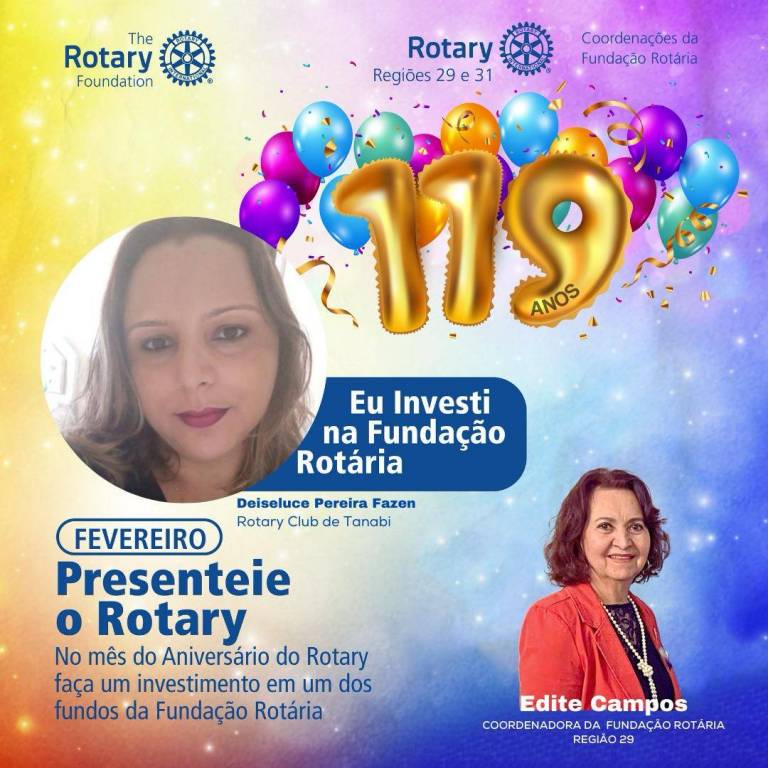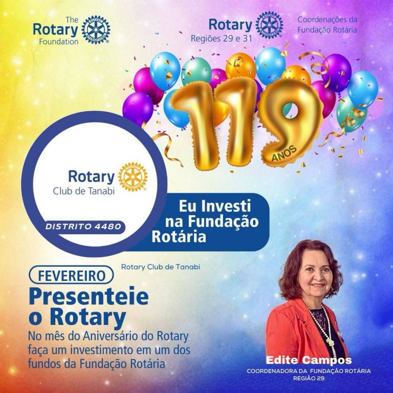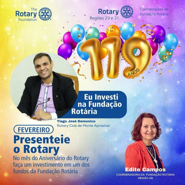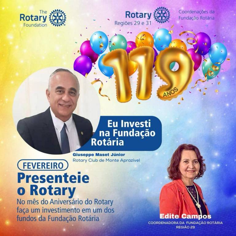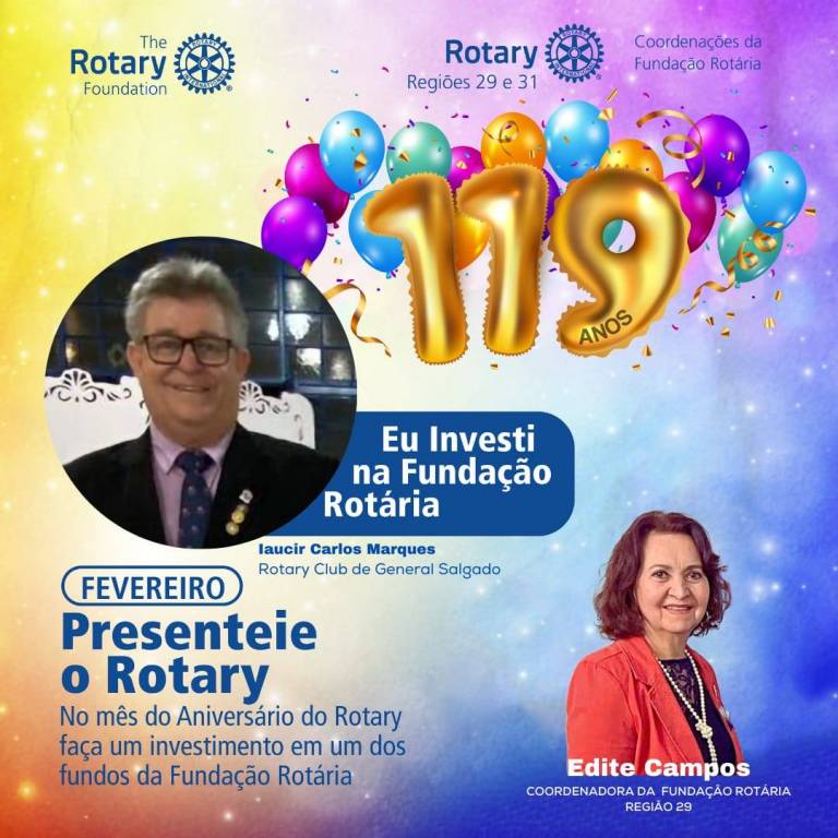 Nos 119 anos do Rotary International, VAMOS INVESTIR NA FUNDAÇÃO ROTÁRIA , temos boas premiações aos clubes com maior doações a Fundação Rotaria aos Fundos Anual e da Pólio Plus, depósitos efetuado nos meses de fevereiro e março/24, com exceção dos recursos advindos da promoção dos Panetones Solidários, pois alguns clubes já estão em débito com o Distrito,