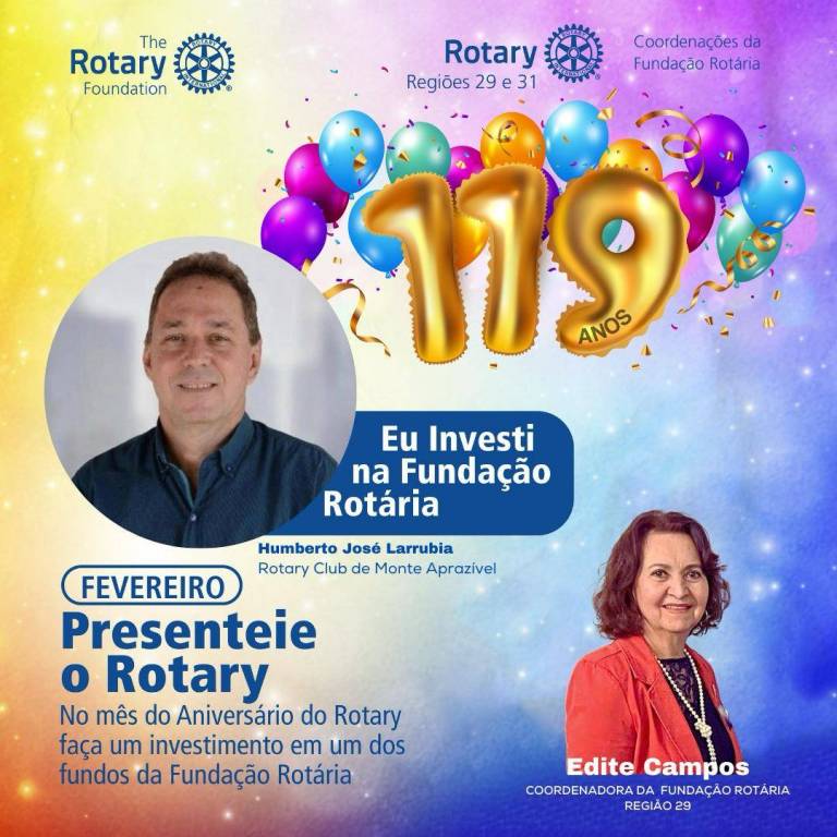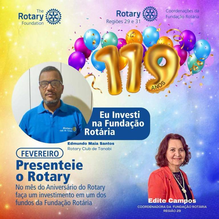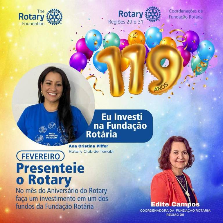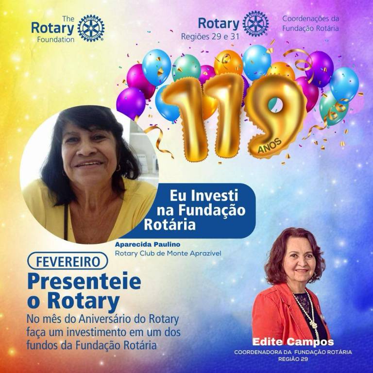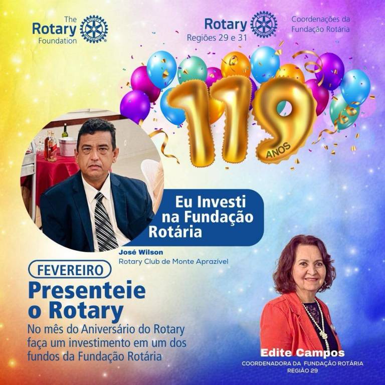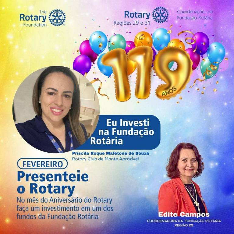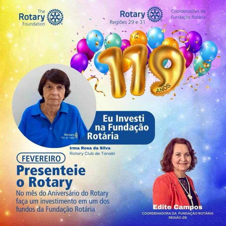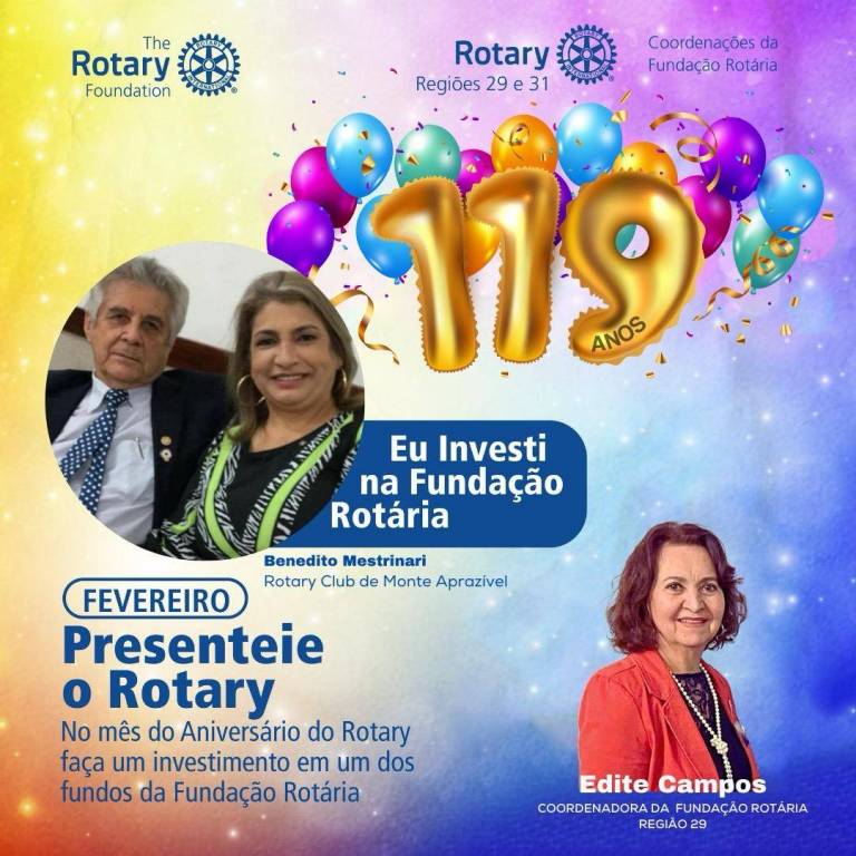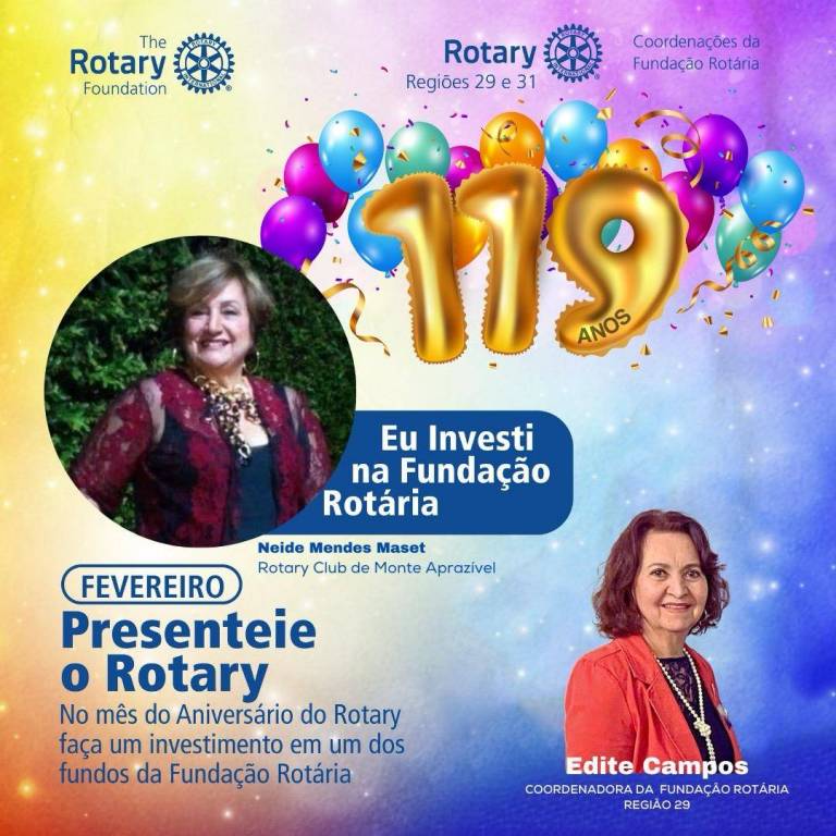 Nos 119 anos do Rotary International, VAMOS INVESTIR NA FUNDAÇÃO ROTÁRIA , temos boas premiações aos clubes com maior doações a Fundação Rotaria aos Fundos Anual e da Pólio Plus, depósitos efetuado nos meses de fevereiro e março/24, com exceção dos recursos advindos da promoção dos Panetones Solidários, pois alguns clubes já estão em débito com o Distrito,