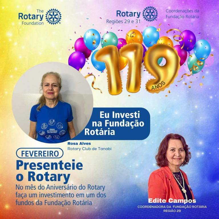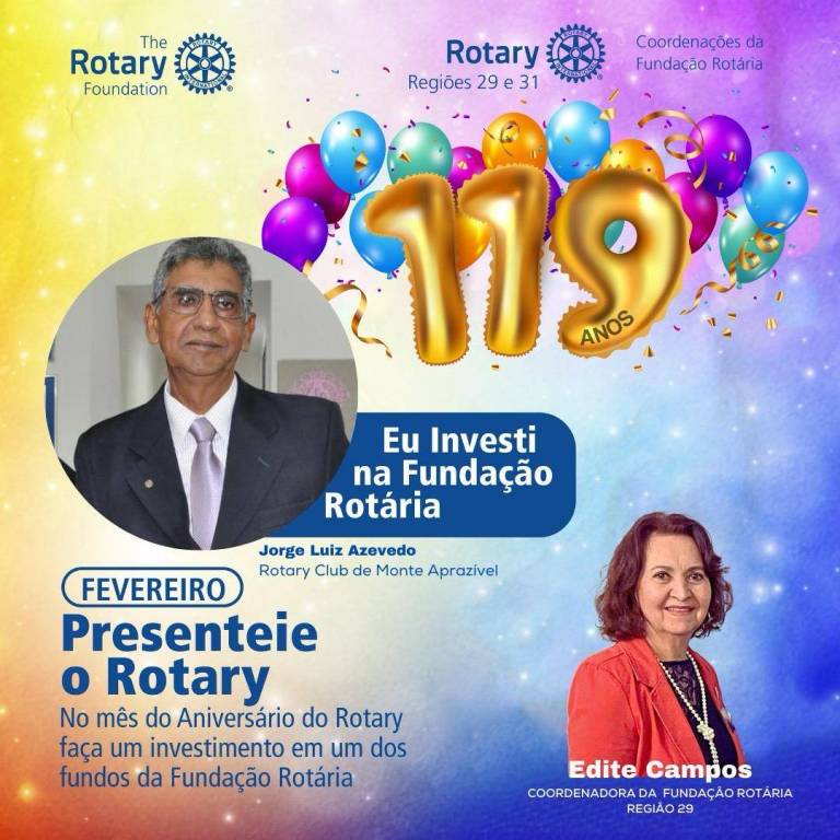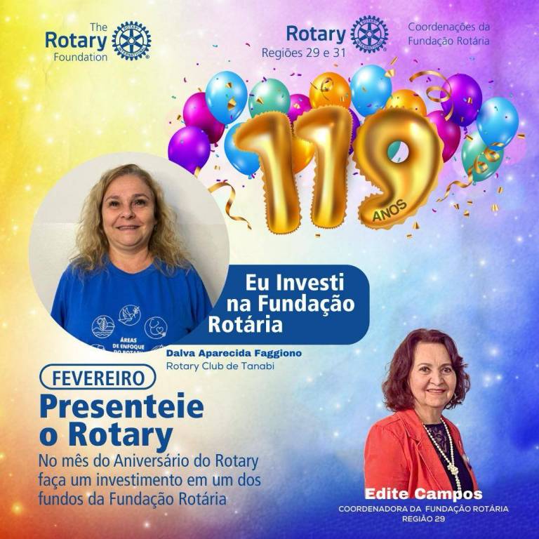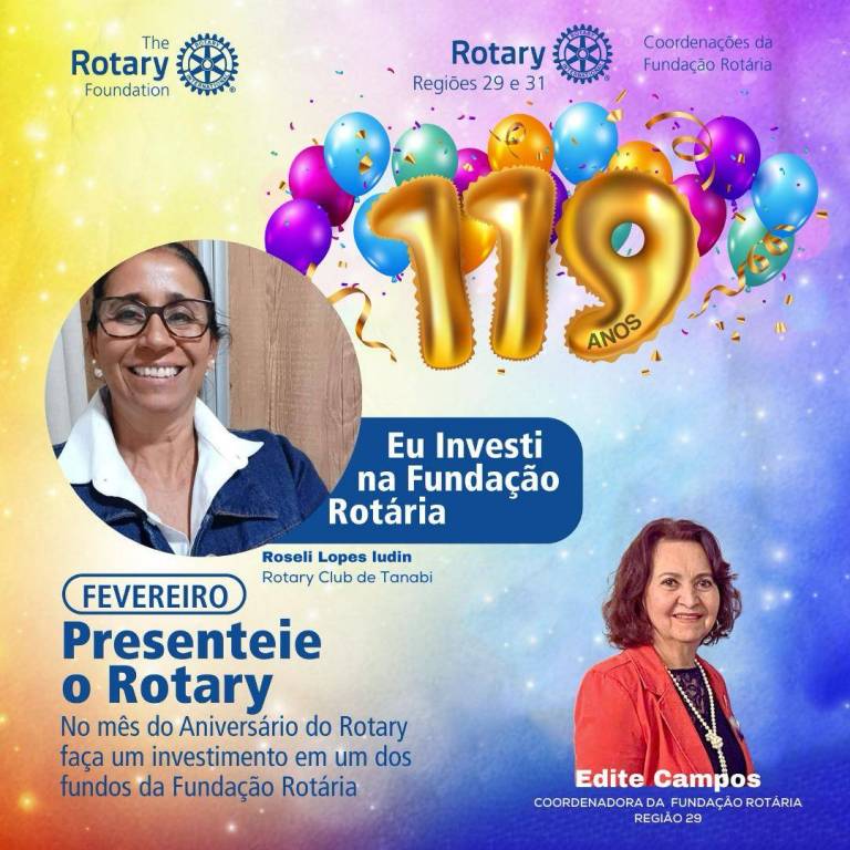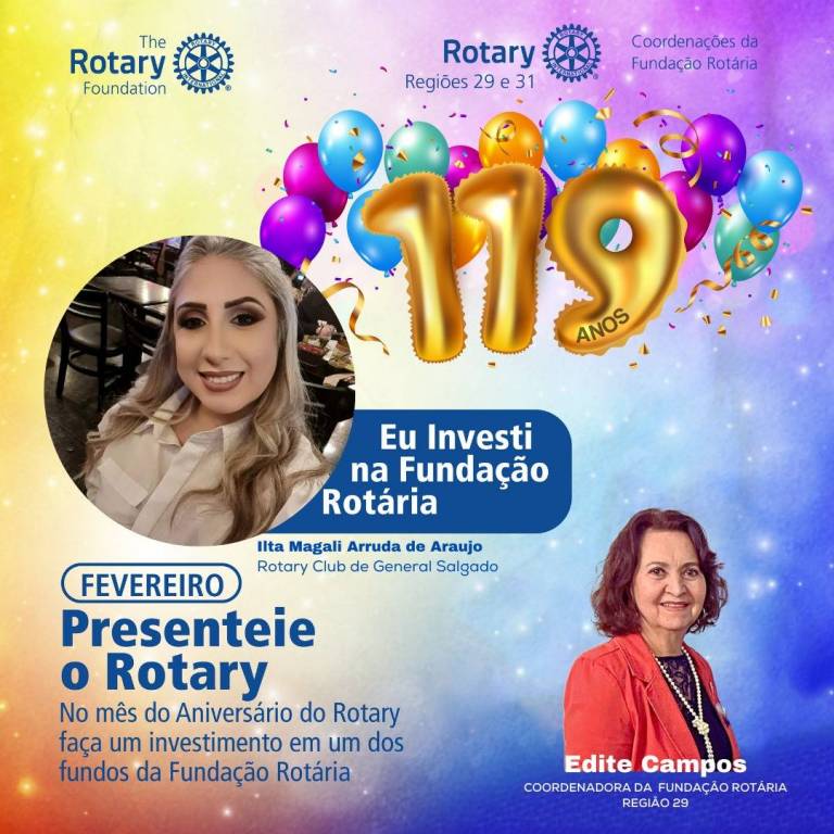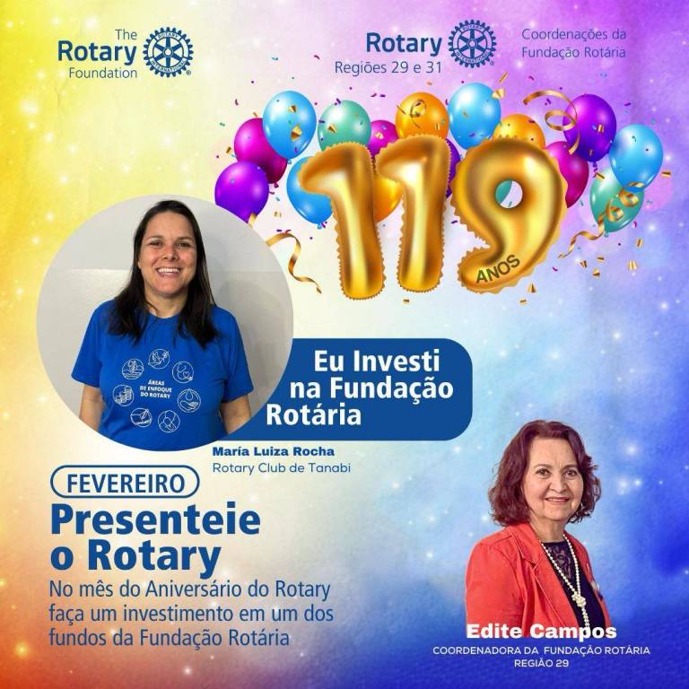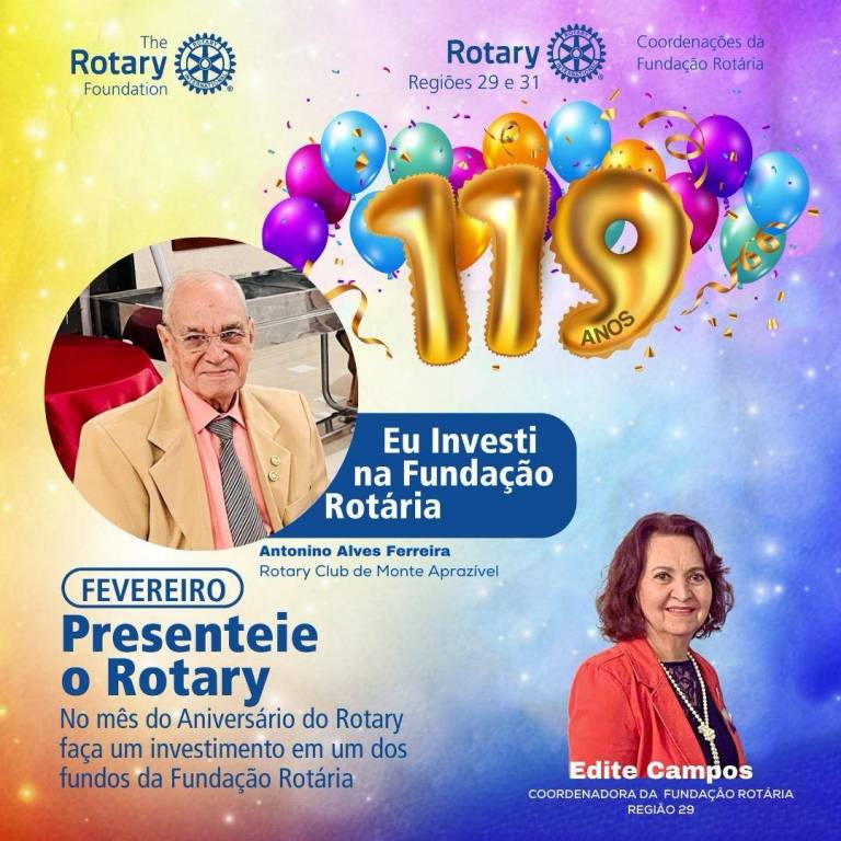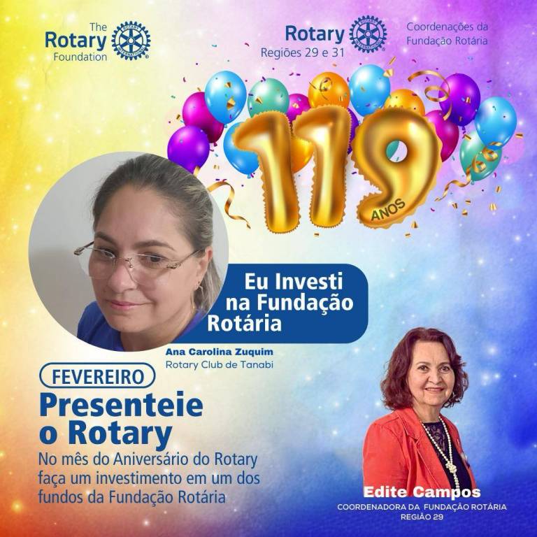 Nos 119 anos do Rotary International, VAMOS INVESTIR NA FUNDAÇÃO ROTÁRIA , temos boas premiações aos clubes com maior doações a Fundação Rotaria aos Fundos Anual e da Pólio Plus, depósitos efetuado nos meses de fevereiro e março/24, com exceção dos recursos advindos da promoção dos Panetones Solidários, pois alguns clubes já estão em débito com o Distrito,