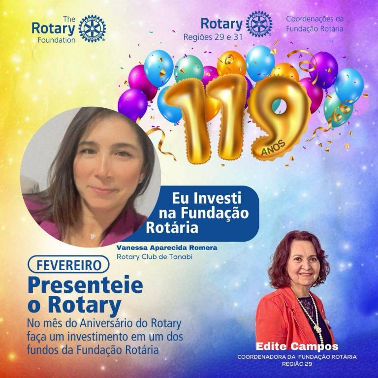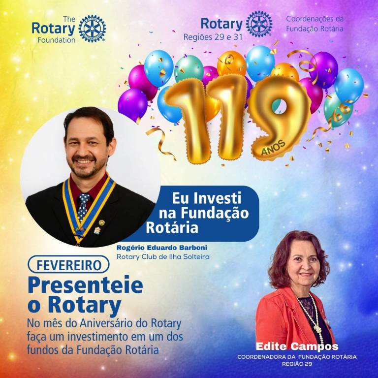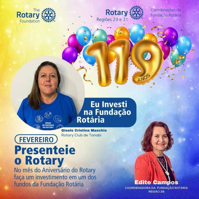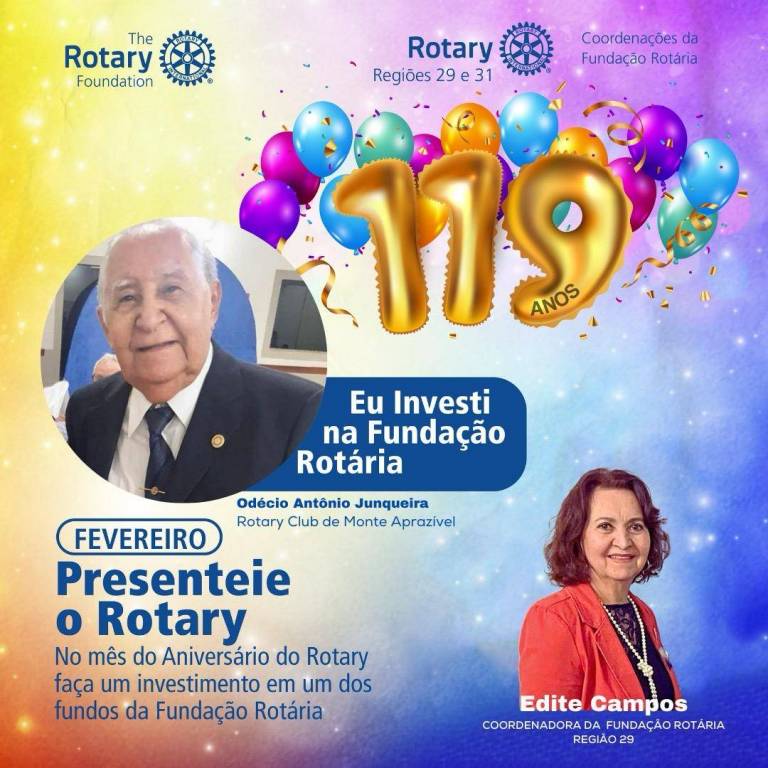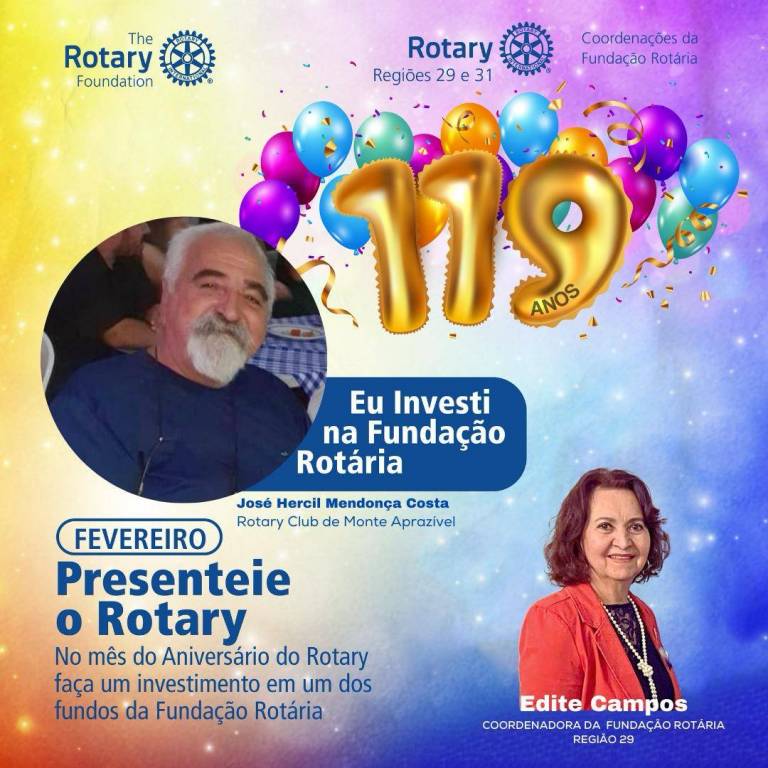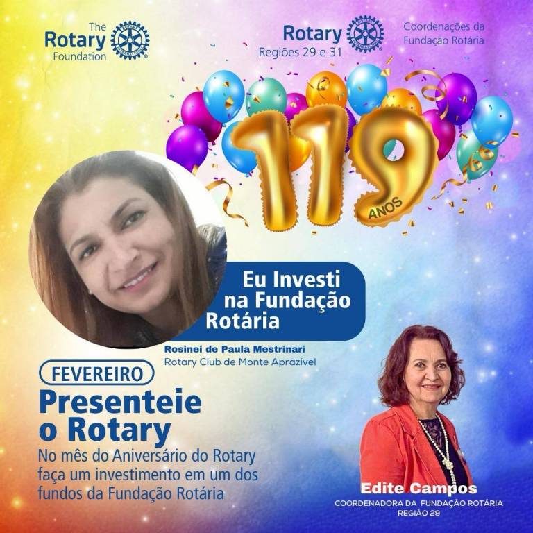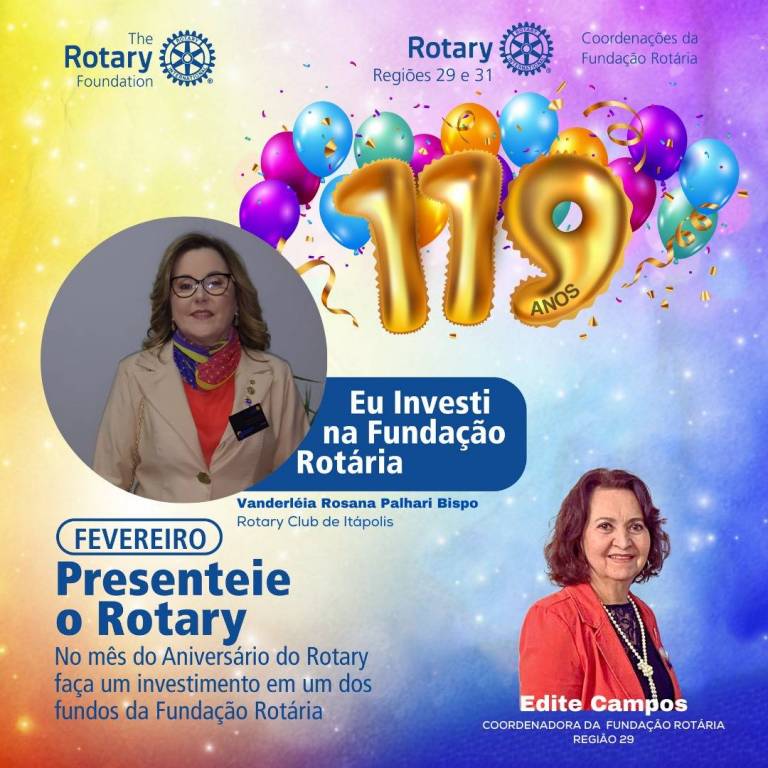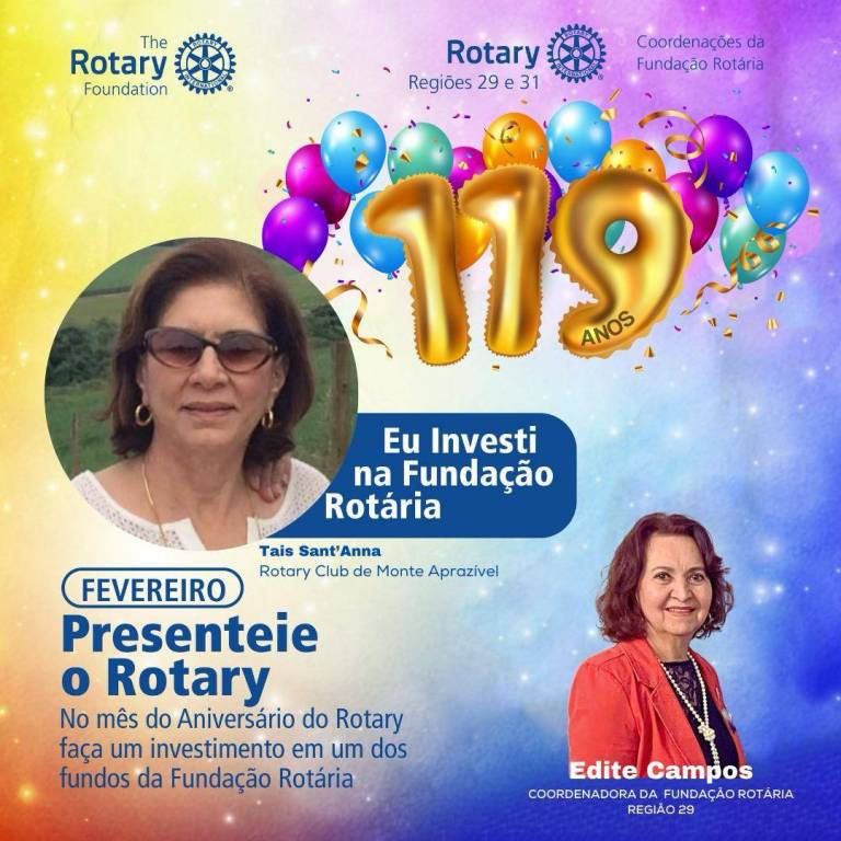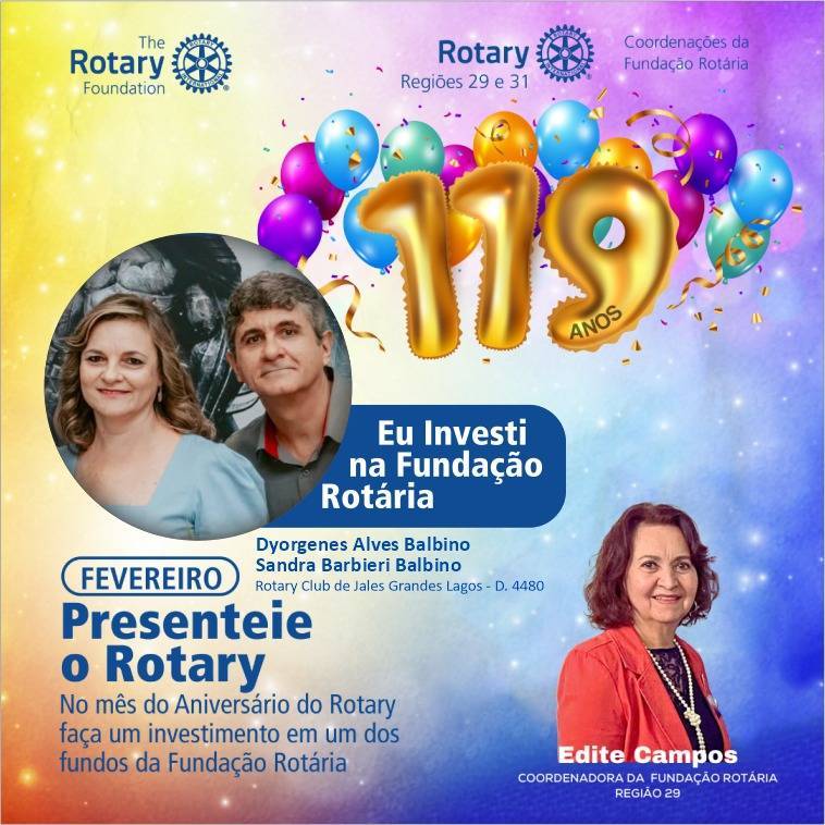 Nos 119 anos do Rotary International, VAMOS INVESTIR NA FUNDAÇÃO ROTÁRIA , temos boas premiações aos clubes com maior doações a Fundação Rotaria aos Fundos Anual e da Pólio Plus, depósitos efetuado nos meses de fevereiro e março/24, com exceção dos recursos advindos da promoção dos Panetones Solidários, pois alguns clubes já estão em débito com o Distrito,
