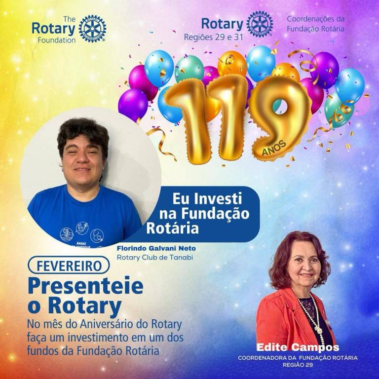 Lado esquerdo central imagem de um rapaz de cabelos escuros, camiseta azul, sorridente, nome Florindo Galvani Neto, Rotary Club de Tanabi. Em moldura azul ao lado: Eu investiu na Fundação Rotária.