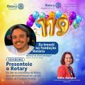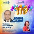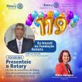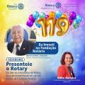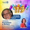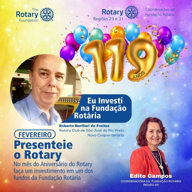 Lado esquerdo central imagem de um senhor calvo, de camisa azul clara, sorri discretamente, nome Roberto Barillari de Freitas, Rotary Club de São José do Rio Preto Novo Cinquentenário. Em moldura azul ao lado: Eu investiu na Fundação Rotária.