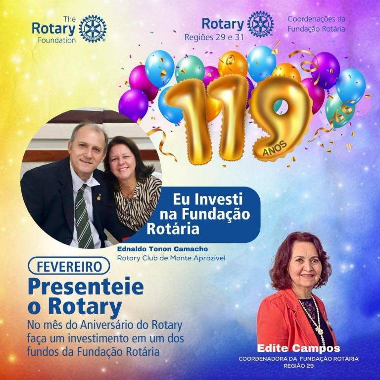 Lado esquerdo central imagem de um casal, ele calvo, de terno ela de cabelos castanhos no ombro e blusa estampada, ambos sorriem, nome Ednaldo Tonon Camacho, Rotary Club de Monte Aprazível. Em moldura azul ao lado: Eu investiu na Fundação Rotária.