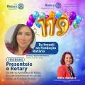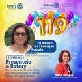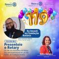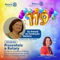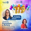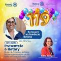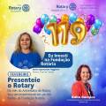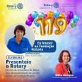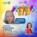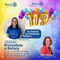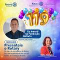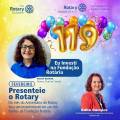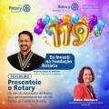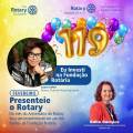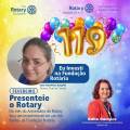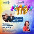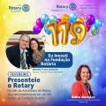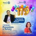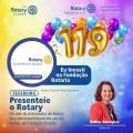 Seguindo abaixo lado esquerdo: em contorno azul: Fevereiro, em destaque azul: Presenteie o Rotary, finalizando com a frase: No mês do aniversário do Rotary faça um investimento em um dos fundos da Fundação Rotária.