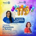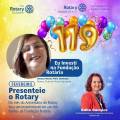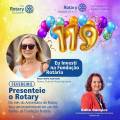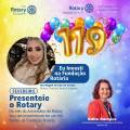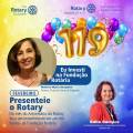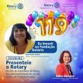 Lado esquerdo central imagem de uma jovem senhora, cabelos escuros, curtos, usa óculos, blusa estampada, sorridente, com a mão esquerda no queixo, nome Laura Leher, Rotary Club de Monte Aprazível. Em moldura azul ao lado: Eu investiu na Fundação Rotária.