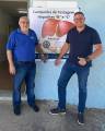 Audiodescrição: na foto, duas pessoas identificadas na frente de um banner. Lado direito um homem cabelos curtos, escuro, usa camiseta azul do Rotary e calça jeans, lado esquerdo um rapaz de cabelos e barba escura, usa tambem camiseta azul do Rotary e calça jeans. Atrás eles na parede um banner Campanha de Testagem Hepatites B e C, desenho de dois figados no centro, abaixo, roda rotária escrito Rotary e parcerias Clubs de Jahu Norte, Terra Roxa e Marilia. Abaixo, no rodapé, Prefeitura municipal de Jau e secretaria de saude.