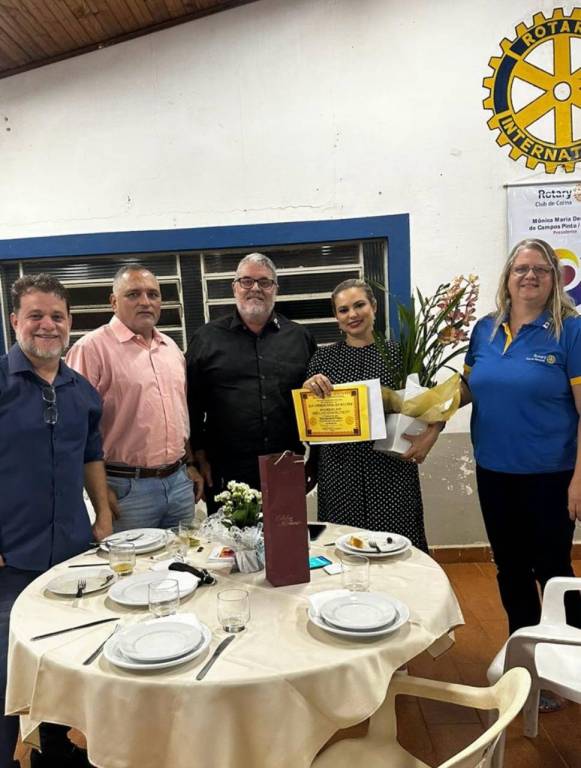 Na foto 3 homens e 2 mulheres dispostos atrás de uma mesa redonda com toalha clara e talheres completos para refeição. Da esquerda para a direita temos 3 homens vestidos com camisa social, seguidos de uma jovem que segura nas mãos um vaso de orquídea e um diploma em papel amarelo todo escrito e por último uma mulher loira que veste camiseta azul do Rotary. Atrás das pessoas uma parede branca com janela grande de ferro emoldurada por uma faixa azul nas laterais e do lado direito acima observamos parte de uma roda rotária e abaixo parte de um banner da gestão atual.