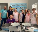 Audiodescrição: na foto, na parede, um banner escrito Rede Promissense de Combate ao Câncer. Na frente do banner, 8 pessoas identificadas, lado a lado, se abraçam e sorriem discretamente. Na frente deles, duas fritadeiras grandes industriais.
