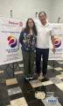 Na foto identificamos uma jovem com cabelos compridos, usando óculos, vestindo seu uniforme de intercambista azul repleto de bottons, calça na cor verde escuro e calçando tênis azul e branco e um senhor com cabelos castanho escuro, calvo, vestindo uma camisa de gola polo do Rotary Club de Santa Fé do Sul e jeans escuro com sapatos na cor marrom. Eles estão posicionados na frente de 3 banners, onde identificamos o logo Crie Esperança no Mundo com informações do Rotaract, Rotary e Interact, todos de Santa Fé do Sul. Estão em uma sala com paredes em tom claro e piso quadriculado em tons diversos. Logo abaixo o logo do Rotary Youth Exchange 4480